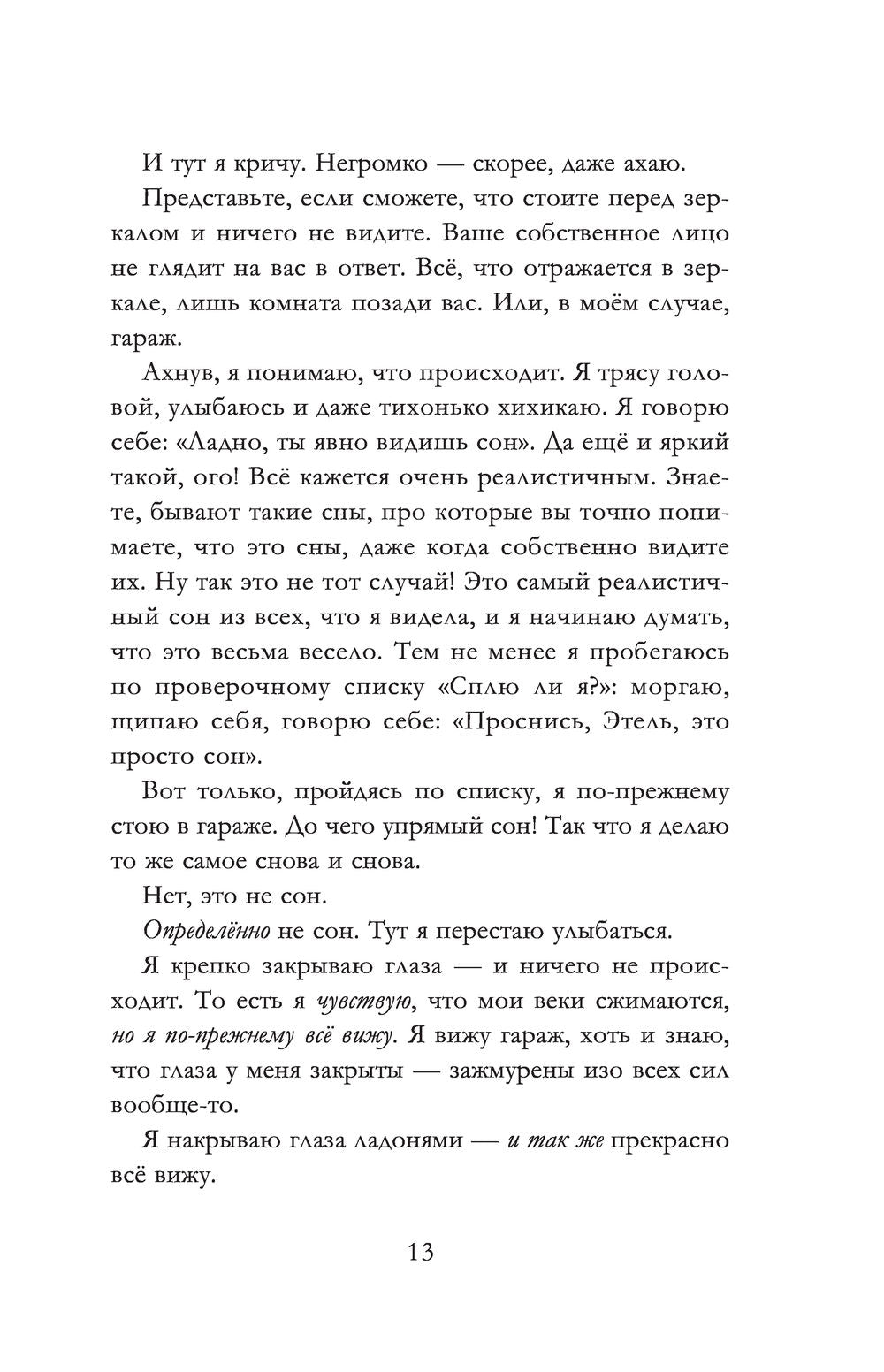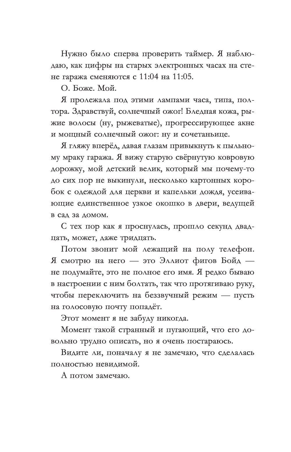 Этель Ледерхед двенадцать, и у неё, как у многих в этом возрасте, на лице прыщи. И живёт она с бабушкой, потому что сирота. И друзей в школе почти совсем нет. Только один, новенький, Бойди, с которым тоже никто дружить не хочет. В общем, кажется, что всё идет наперекосяк, но на самом деле всё становится ещё хуже, когда Этель получает в подарок настоящий солярий. Потому что однажды она, позагорав в нём, вдруг становится невидимой!