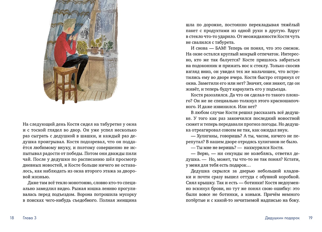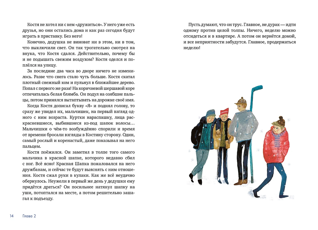 "Костя поёжился. Он заметил в толпе того самого мальчика в красной шапке, которого недавно сбил с ног. Всё ясно! Красная Шапка пожаловался на него дружбанам, и сейчас те будут выяснять с ним отношения. Костя сжал руки в кулаки. Как же всё неудачно обернулось. Неужели в первый же день у дедушки ему придётся драться? Он посильнее натянул шапку на уши, потоптался на месте, а потом решительно зашагал к подъезду."