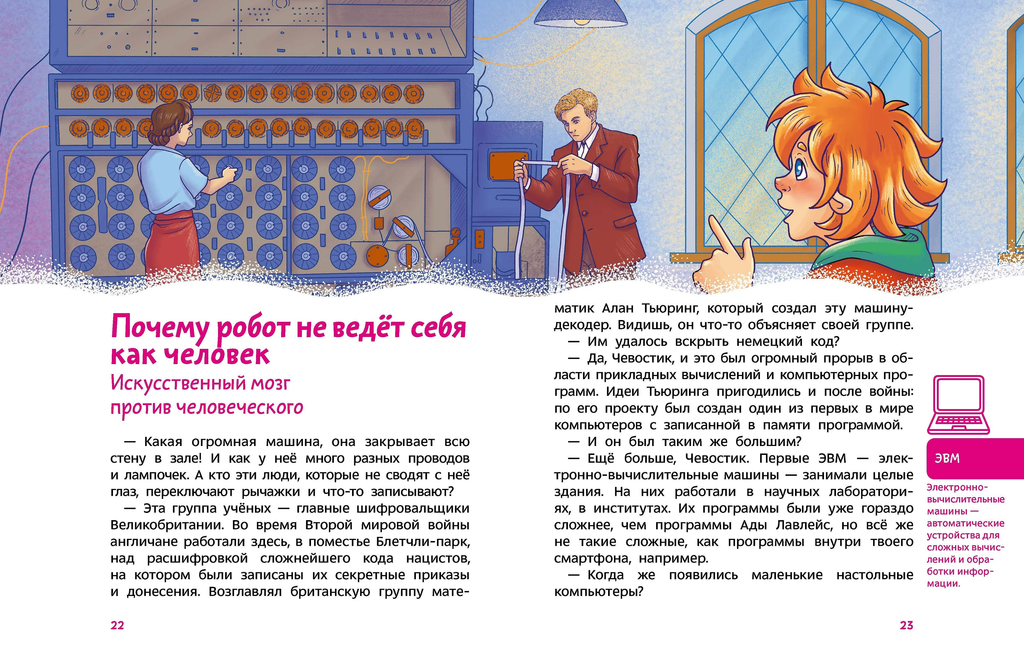 В новой энциклопедии Чевостик и дядя Кузя разберутся, что такое искусственный интеллект и как эта технология применяется в жизни. Герои познакомятся с первой программисткой Адой Лавлейс, побывают на площадке для тренировки роботов, в человеческом мозгу и в микропроцессоре. А ещё узнают, как нейросети могут помочь врачам, архитекторам и даже режиссерам, и научатся использовать ИИ ответственно и с умом.