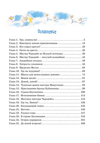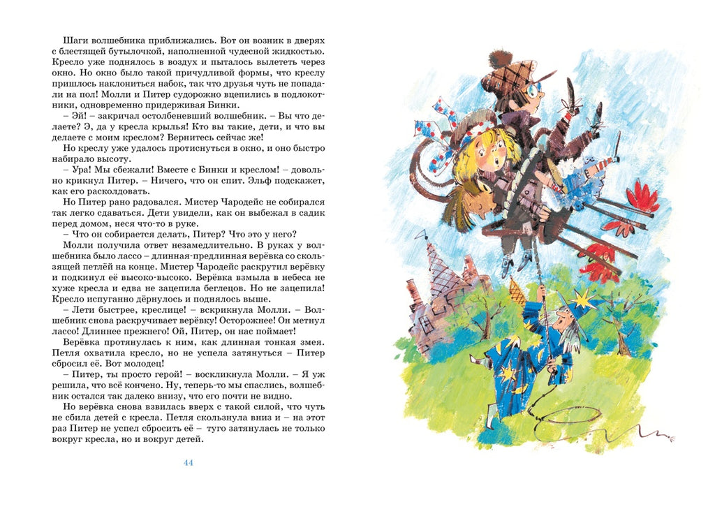 Приключения продолжаются! Молли и Питер приехали домой на каникулы. Они так соскучились по своему другу Бинки! И... по волшебному креслу, которое умеет летать. Друзей вновь ждут невероятные путешествия. На волшебном кресле они посетят Блуждающий замок и Остров сюрпризов, побывают в удивительной стране Вкуснятине и даже поучатся в школе для непослушных домовят!