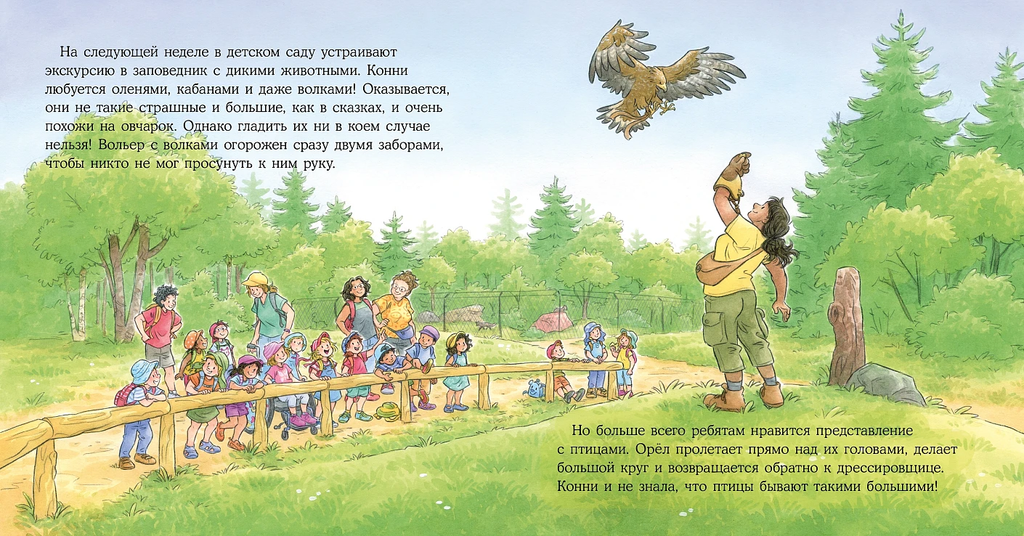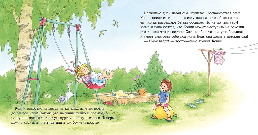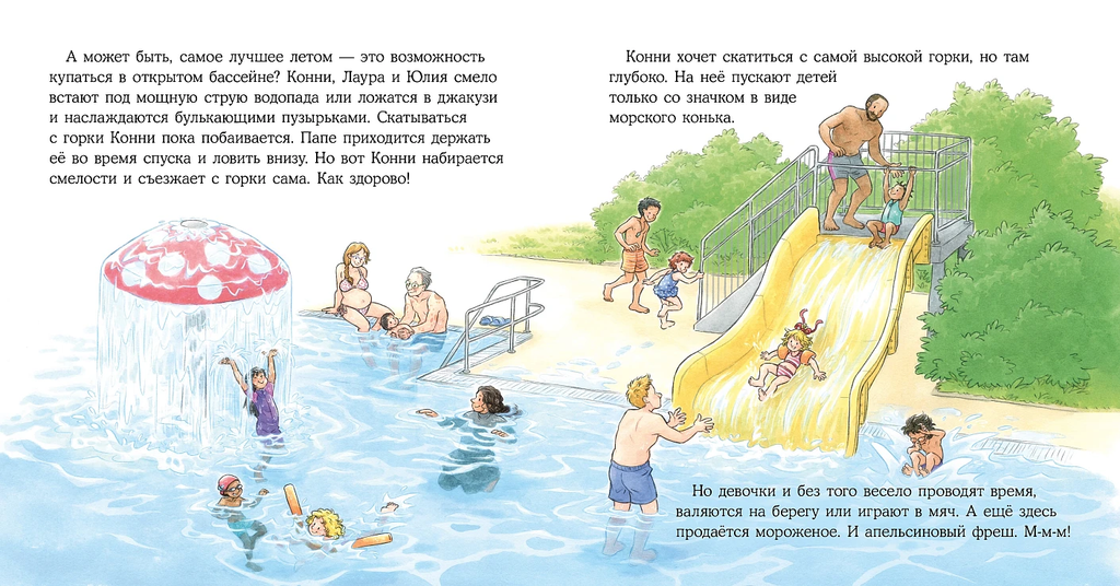 Наконец-то наступило лето, самое чудесное время года! Оно пахнет солнцезащитным кремом и черешней. Конни счастлива, потому что теперь она может ходить босиком, купаться, кататься на водном велосипеде с папой и мамой, ходить на экскурсии, есть мороженое и наслаждаться свежим воздухом.