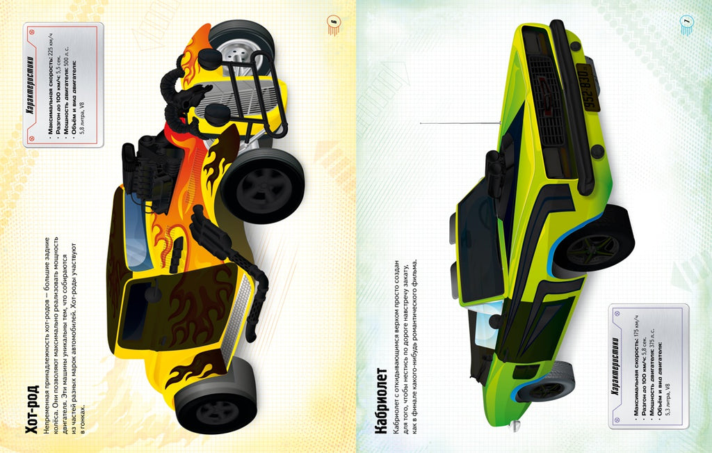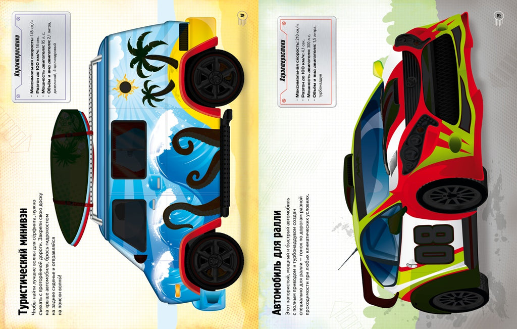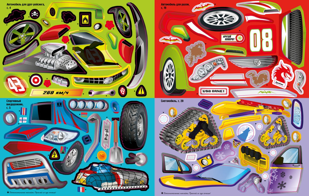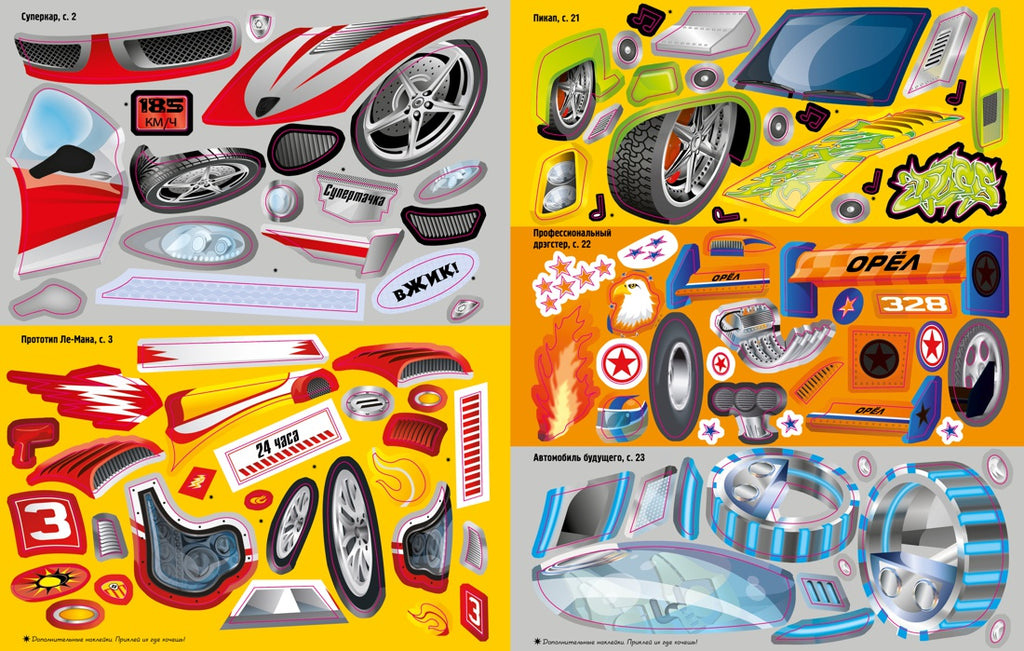 В этой книжке ты найдёшь самые разные автомобили - от кабриолета и пикапа до суперкара и современного гоночного болида. Собери и дополни машины с помощью ярких наклеек.
