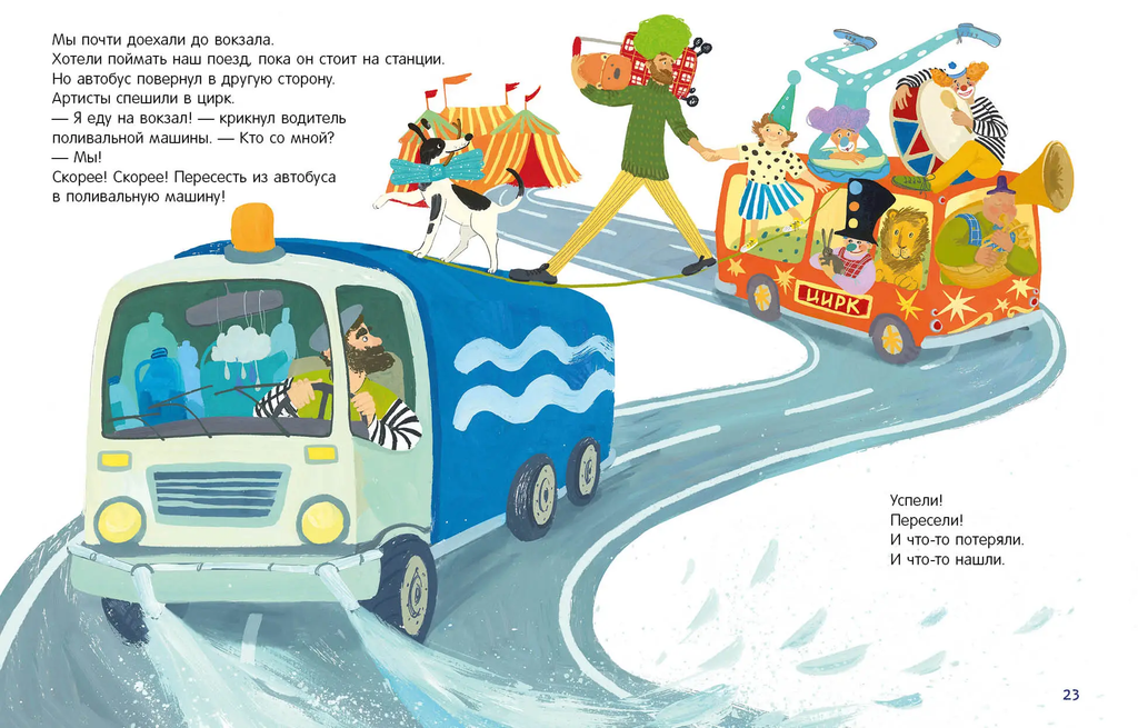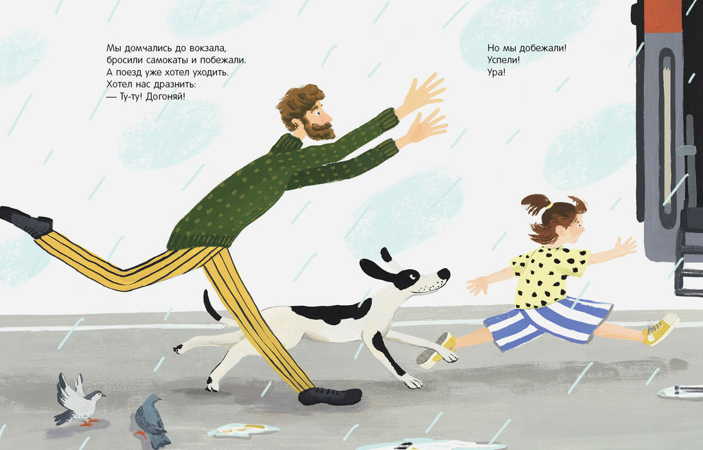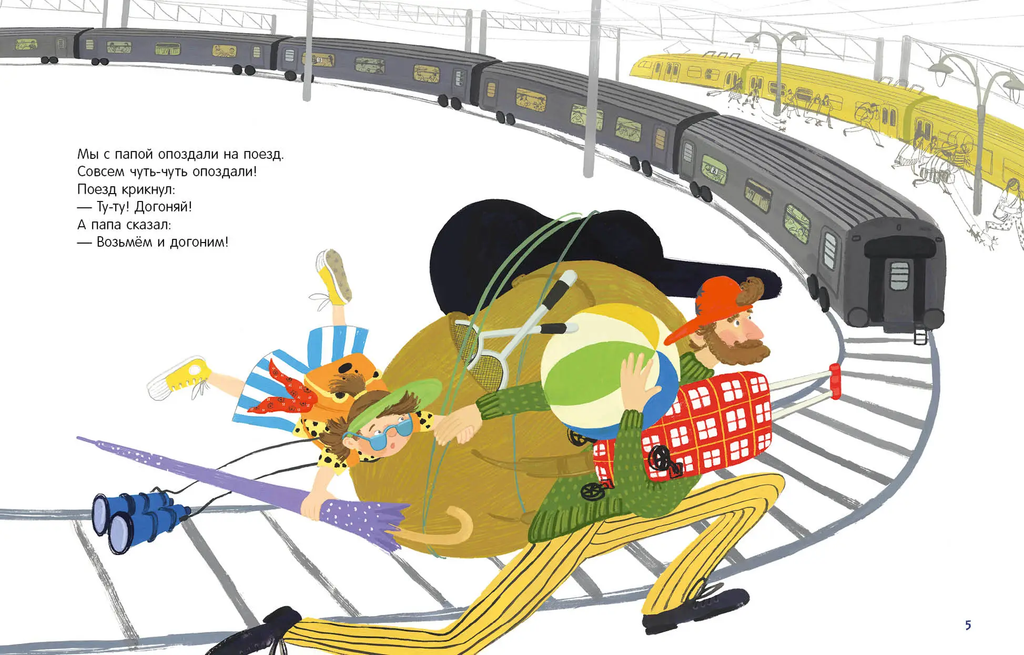 Перед вами весёлая история о том, как папа с дочкой догоняют свой поезд. Они опоздали совсем чуть-чуть, но не унывают и пытаются его догнать на такси, на грузовике, на мотоцикле, на самокатах и даже на лошадях! И каждый раз их ждут новые приключения. А если в дороге что-то теряется - не беда, ведь находки гораздо интереснее потерь!