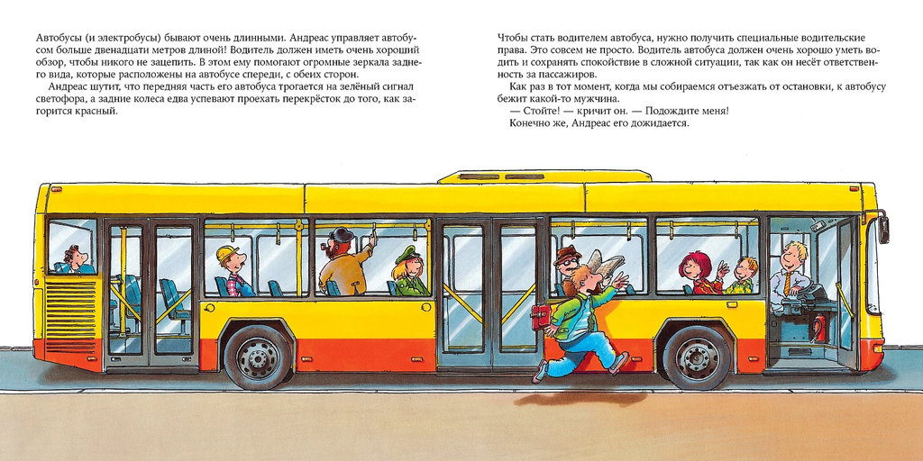 "Автобусы (и электробусы) бывают очень длинными. Андреас управляет автобусом больше двенадцати метров длиной! Водитель должен иметь очень хороший обзор, чтобы никого не зацепить."