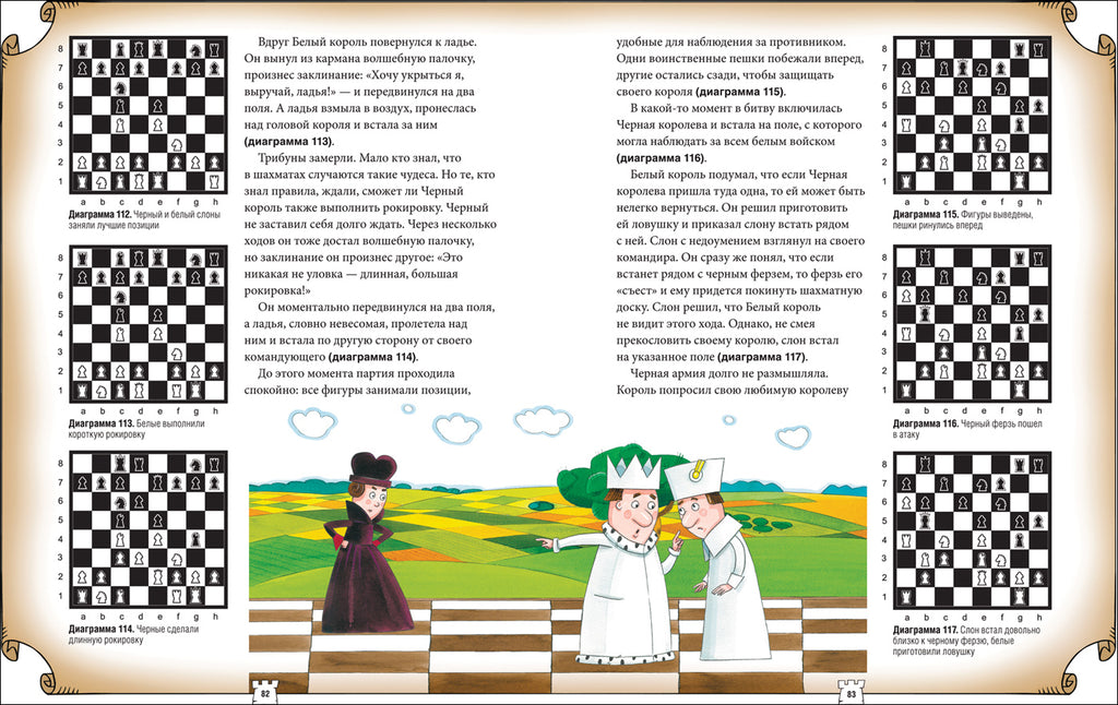 Авторы книги сочинили забавный сказочный рассказ о целой шахматной стране, в которой идет постоянное противостояние двух королей и их армий. На простых примерах, с помощью наглядных рисунков и схем юные читатели научатся разыгрывать партии, правильно записывать сделанные ходы и освоят разные тактические приемы.