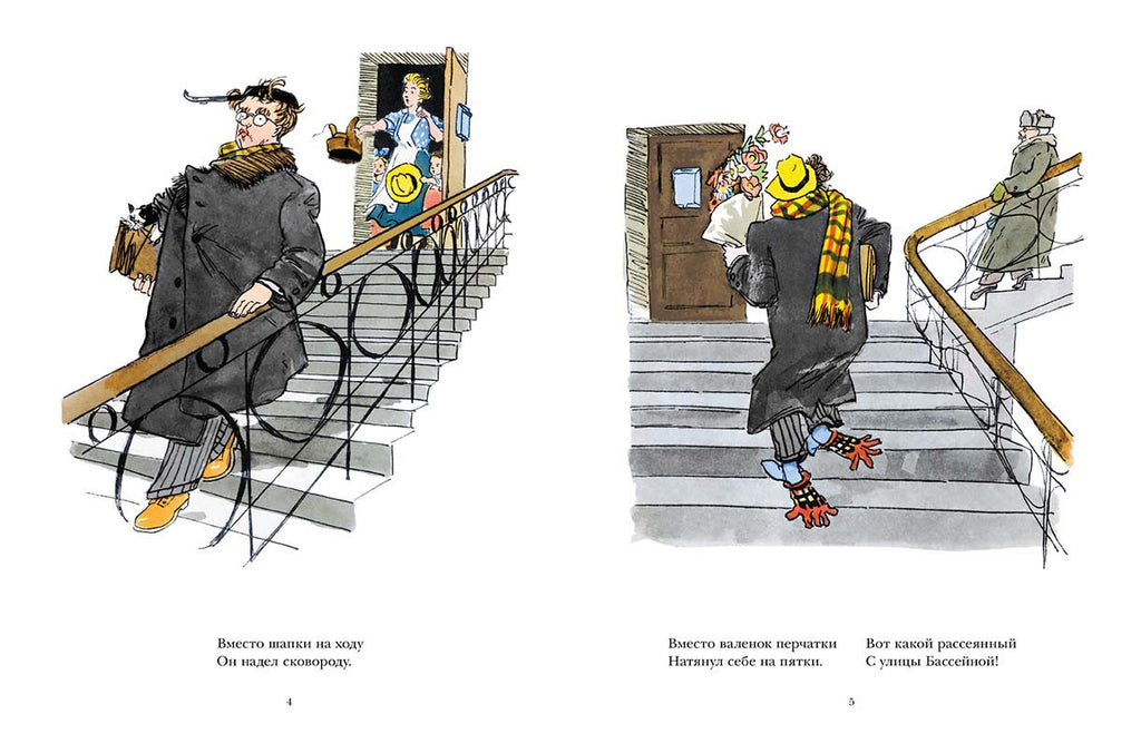 Образ «рассеянного» скорее сатирический, но благодаря иллюстрациям Аминадава Каневского он выглядит милым и обаятельным чудаком. К тому же его «рассеянный» очень похож на автора – именно так выглядел Маршак в тридцатые годы прошлого века; именно с таким портфелем, набитым рукописями, он ходил на работу.