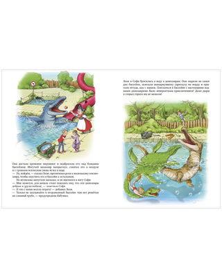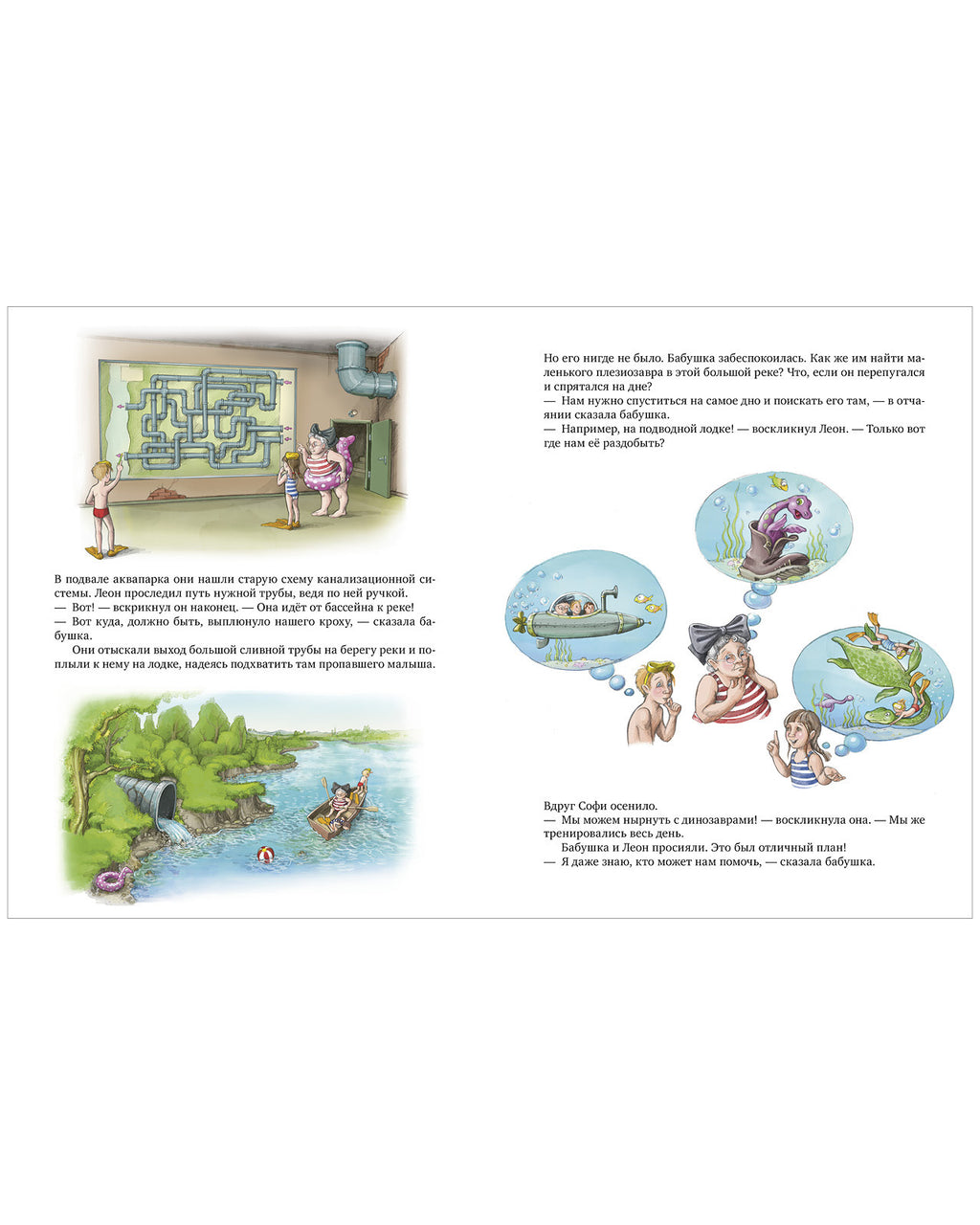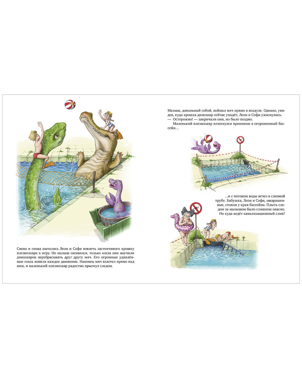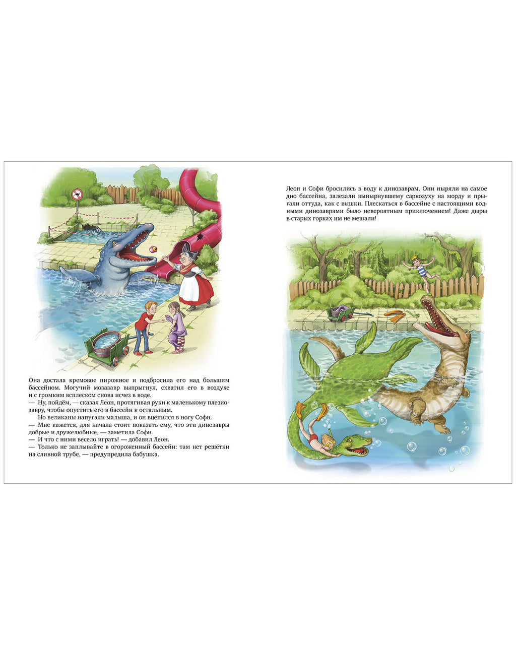 У бабушки Леона и Софи есть секрет: она разводит настоящих динозавров! Для своих водоплавающих питомцев бабушка нашла идеальное место — заброшенный аквапарк посреди леса. Аквапарк обожают все — и динозавры, и ребята. Но в разгар водных развлечений так легко забыть об осторожности! Во время игры в мяч происходит страшное: маленький плезиозавр исчезает в сливной трубе. Смогут ли бабушка и ее внуки спасти малыша?