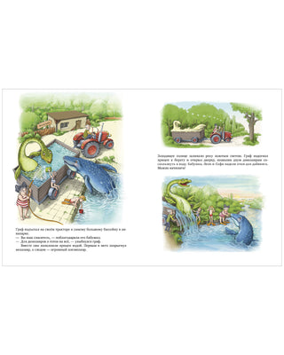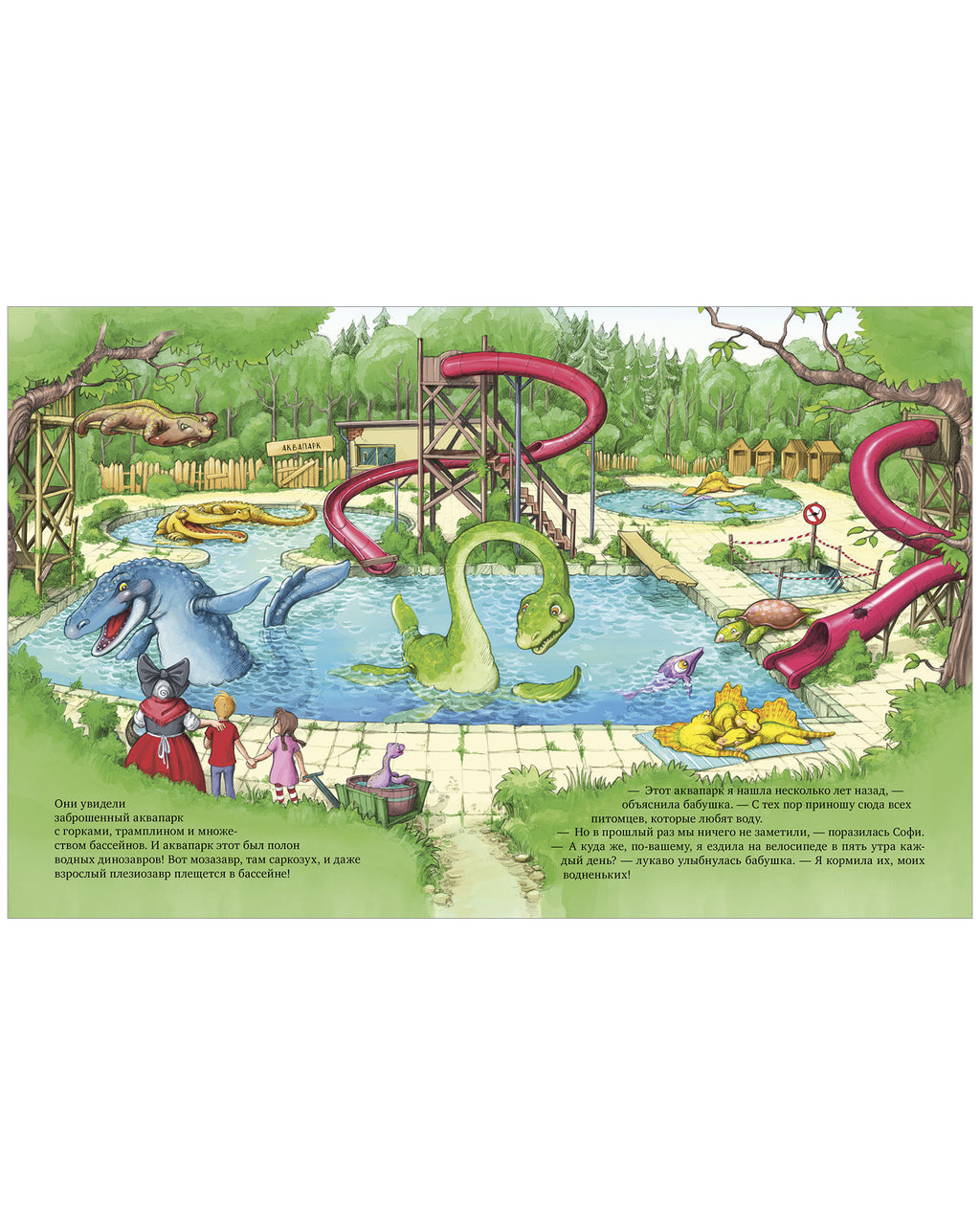 «Динозавры в аквапарке» — приключенческая история в картинках. Герои книги познакомятся с водными гигантами и будут плескаться в бассейне с веселыми мозазавром, саркозухом и плезиозавром.