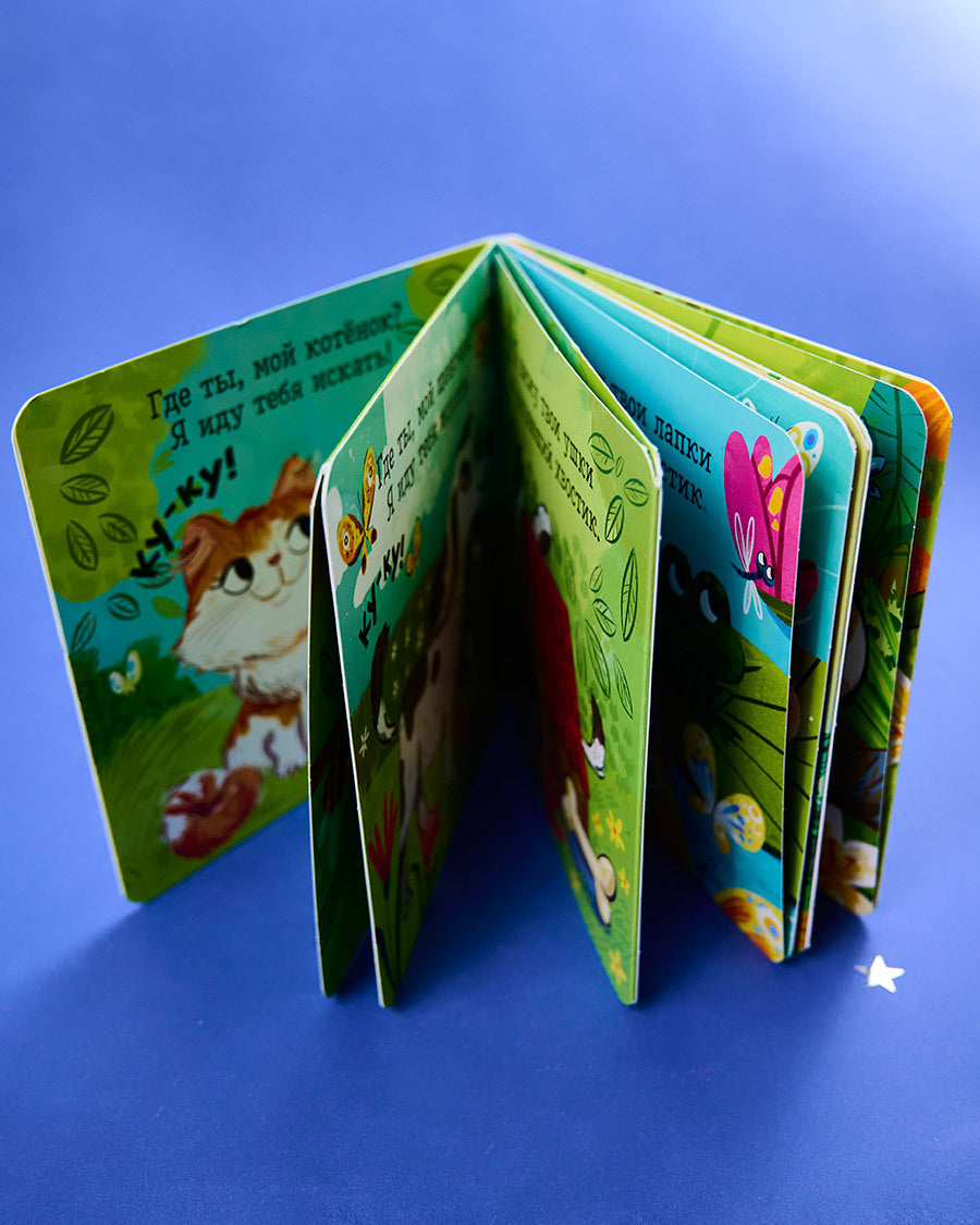 "Ку-ку! Где ты, мой малыш? Книжка-раскладушка" — идеальная первая книга для развития внимательности ребенка. Ищите на картинках лапки, хвостики, ушки, макушки, а их маленьких хозяев — под большими клапанами.